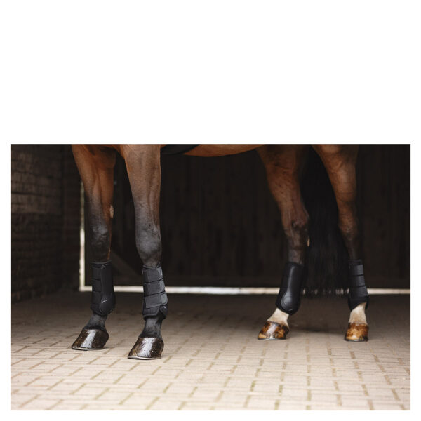 The inside is lined with shock-absorbing neoprene that is breathable, so it transports moisture and heat to the outside and keeps the leg cool and dry. The semi-hard strike pad bends well with the shape of the leg for a perfect ft. The edges are covered with tricot to prevent chafing on the horse’s leg. The Velcro fasteners are sturdy and stylishly embossed with the logo. The elastic in the closures ensure a secure fit.