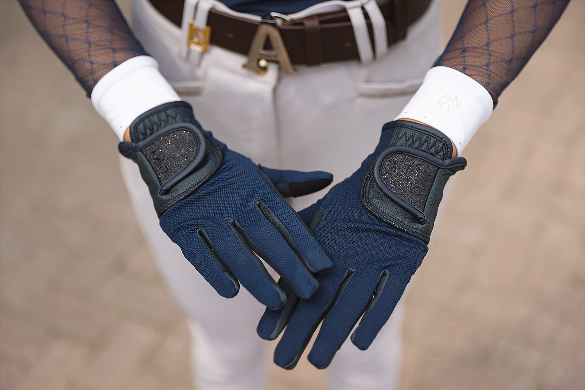 These ANKY® technical gloves are made of breathable mesh material and stylishly printed synthetic leather. The elastic mesh and elasticated wrist provide a good fit and the rein reinforcement provides more grip on the reins. The touchscreen material on the thumb and index finger and the glitter material finish make this glove a beautiful eye-catcher during a competition.