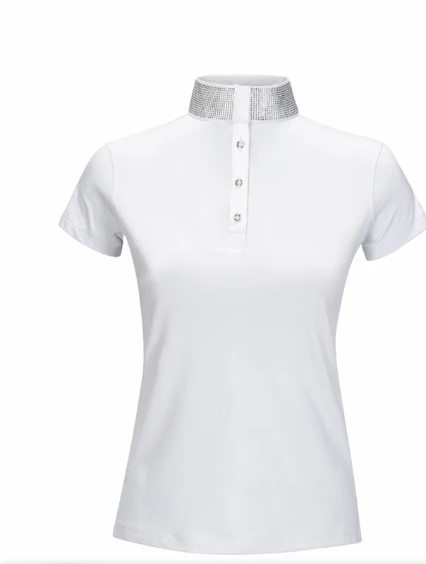 Denna topp är fantastisk att ha nära kroppen, materialet andas och är så följsamt och svalt även de varmaste dagarna. På grund av den fina kragen med allt bling behövs inte heller plastrong utan skjortan i sig förgyller alla tävlingsoutfits!