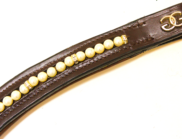 Glen Gordon Ariel är ett vackert svängt pannband med pärlor och gnistrande äkta Swarovski-kristaller. Foder i kalvskinn gör det extra skönt för hästen. Den mjuka U-formen följer huvudets konturer på ett naturligt sätt.